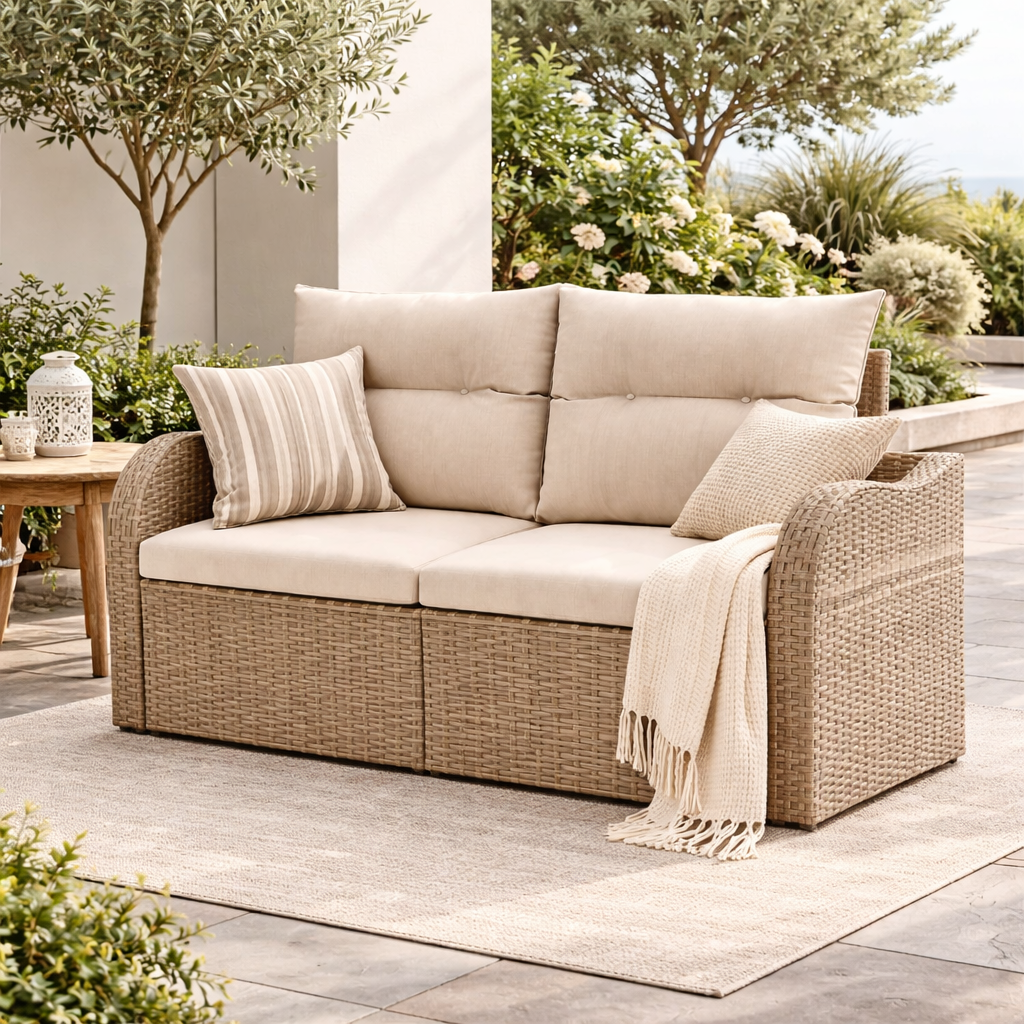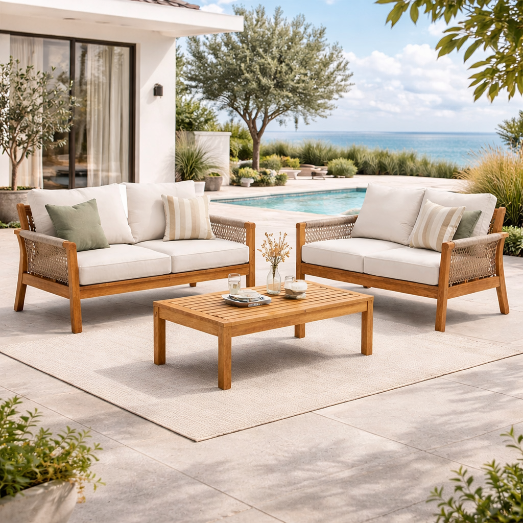 This stylish outdoor furniture collection features a beautifully crafted wicker loveseat and a modern wooden sofa set, designed to bring comfort and elegance to any patio, garden, or backyard space. The loveseat is made from durable handwoven PE rattan with soft beige cushions, offering a cozy and compact seating solution. The wooden set includes a loveseat, armchair, and coffee table, combining solid wood construction with breathable rope details for a natural and contemporary look.